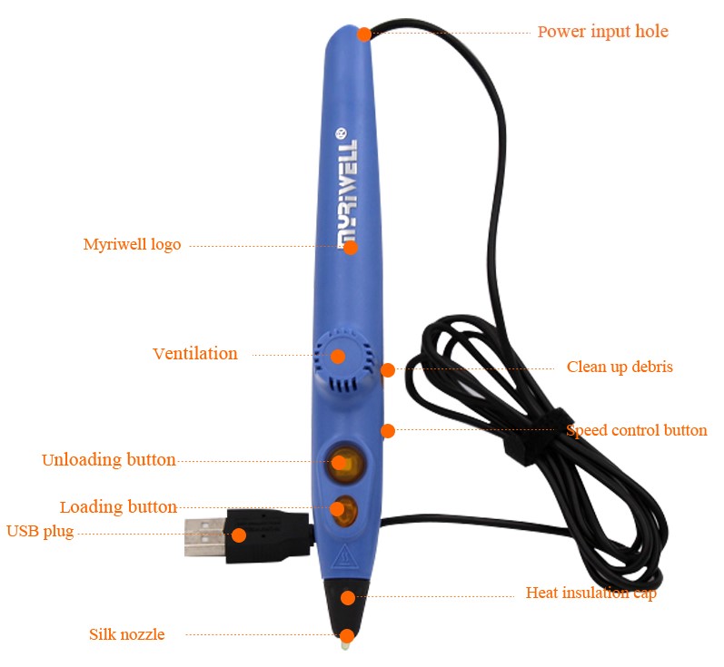 The 3D printing pen Myriwell RP-200A is one of the latest possible models from a reputable manufacturer. The shape of Myriwell RP-200A resembles a submarine, and only pleasant sensations remain from use. Inside there is a powerful cooling system that protects against heat. Very easy and practical. The 3D printing pen Myriwell RP-200A is easy-to-use model and works exclusively on environmentally friendly plastic PCL. PCL does not emit smells during printing.